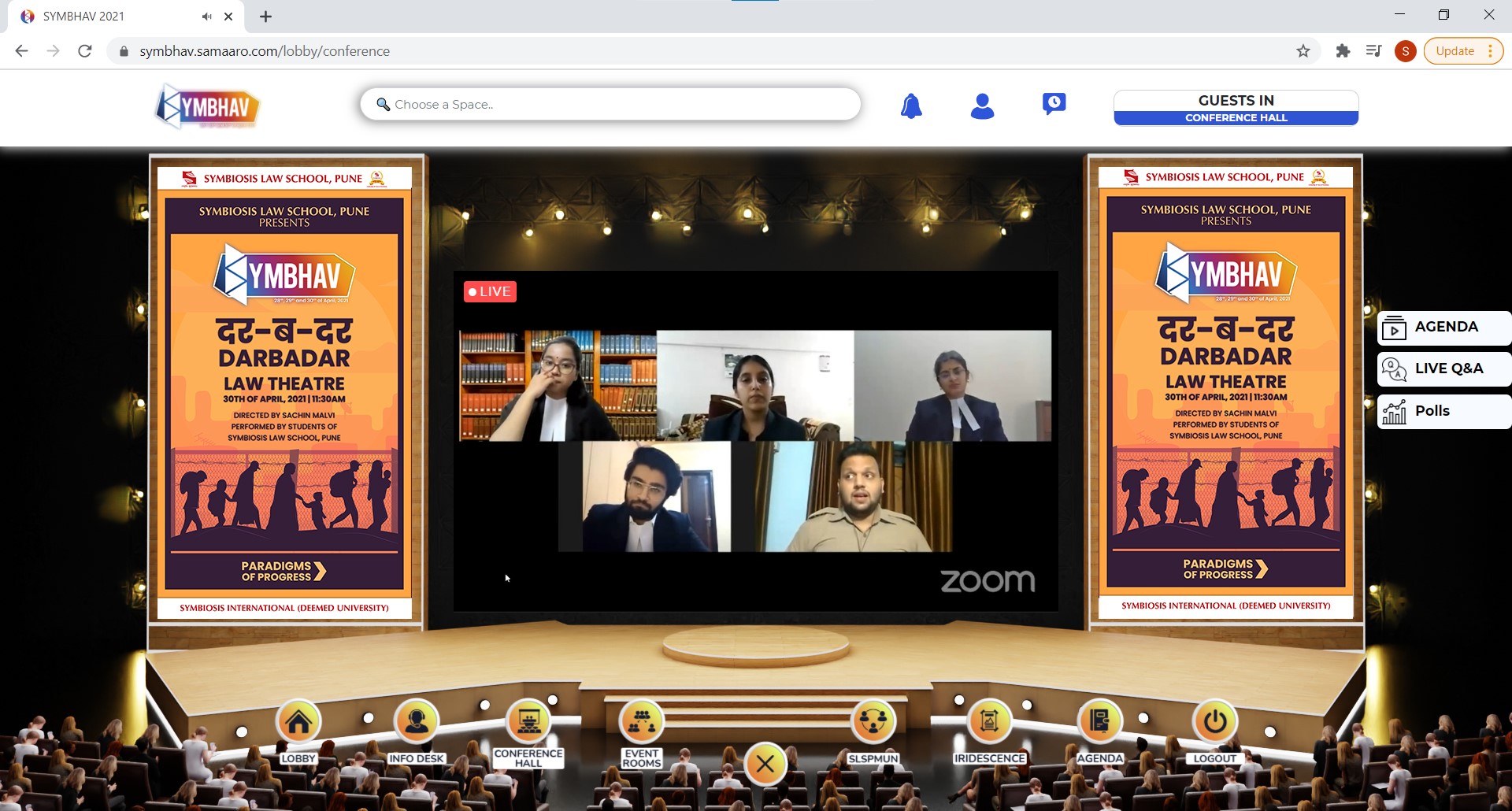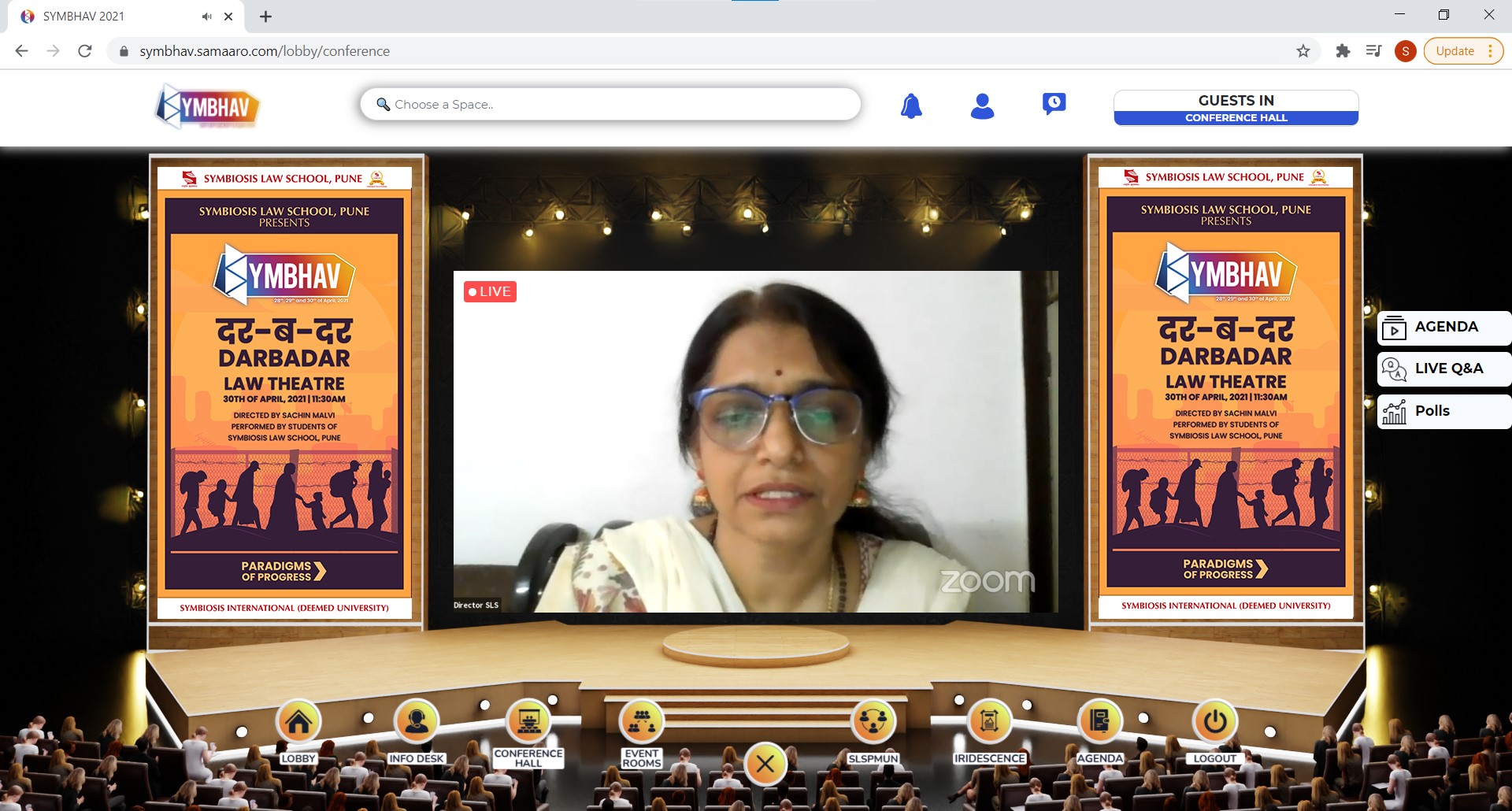 Symbiosis Law School Pune (SLS-P), a constituent of Symbiosis International (Deemed University) presented the Tenth Edition of Annual Law Theatre during the annual cultural fest, Symbhav 2021 . This unique event is the brain-child of Prof. (Dr.) S.B Mujumdar, Chancellor of Symbiosis International (Deemed university) who visioned amalgamation of drama and law. The event was held on 30th of April, 2021 at 11:30AM on the online platform “Symbhav Samaaro” and was attended by over 895 national and international attendees.