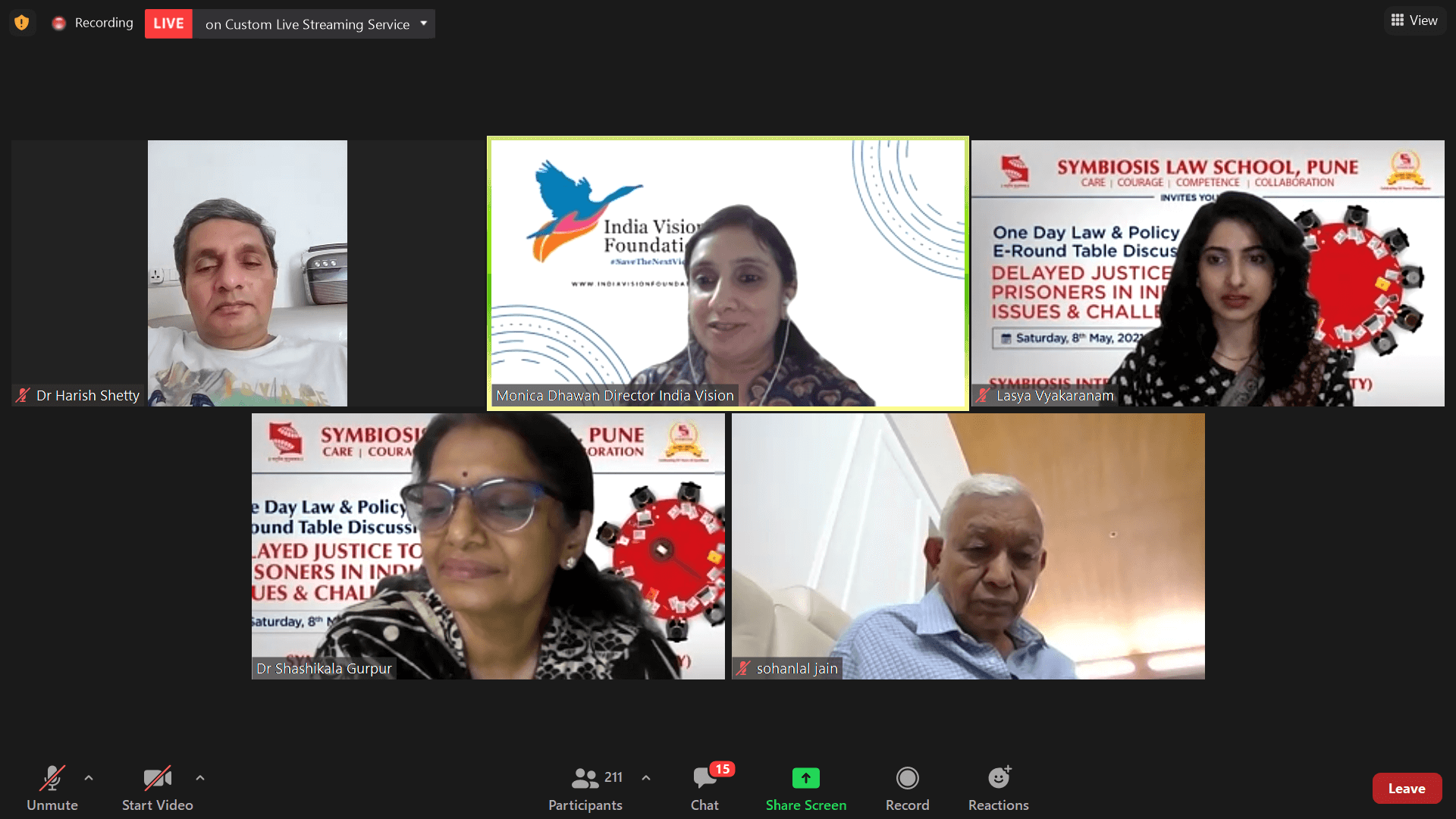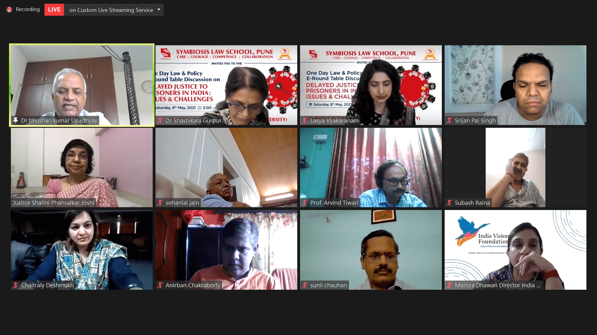 In furtherance of the last five years of Symbiosis Law School Pune’s work in the Yerawada Prison and initiative by Hon’ble Chancellor Dr. S. B. Mujumdar, SLSP [a constituent of Symbiosis International (Deemed University)] hosted a One Day Law and Policy E-Round Table Discussion, with special focus on Delayed Justice to Prisoners in India: Issues & Challenges, on the 8th of May, 2021 from 2P.M – 5 P.M. IST via the video conferencing platform Zoom. The roundtable highlighted the issues of inmates languishing in the jails of India and proposed recommendations in the form of an outcome document.