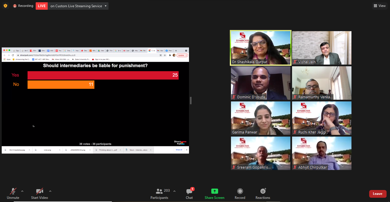 The event began with the welcome address by Dr. Shashikala Gurpur, Fulbright Scholar, Director, Symbiosis Law School Pune, Dean, Faculty of Law, Symbiosis International (Deemed University). In her address, Dr. Gurpur stated that social media holds a vibrant space for the Indian democracy. Dr. Gurpur raised several significant questions for the discussion, that included: - “Are we readjusting the balance of freedom of speech and expression with reasonable restrictions?”; “How far are the regulations by the Ministry of Information and Broadcasting successful in dealing with the threat to democracy as well as freedom of speech and expression of the content creators and media platforms along with the State’s own responsibility of protecting public interest?”. Does this guideline serves global big tech initiatives’ and meet the tripartite test of promulgation, necessity and public interest while blocking their content.