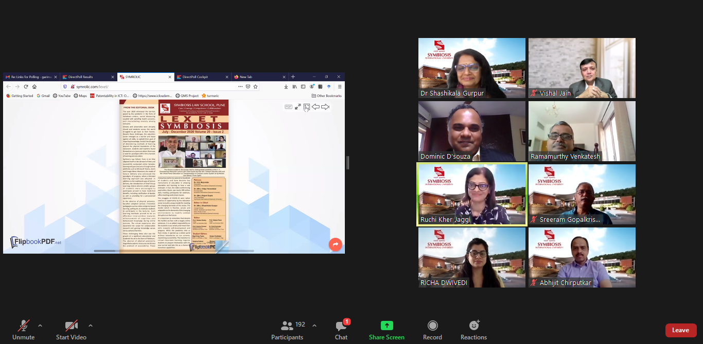 The panel discussion was followed by Paper Presentations in two parallel breakout rooms. The first room was chaired by Dr. Kanan Divetia, Faculty of SLS-Noidaand Dr. Atmaram Shelke, Faculty of Symbiosis Law School, Pune and the discussion was compered by Prof. Richa Dwivedi, Assistant Professor, SLS-P. The panel witnessed 4 paper presentations. The concluding Remarks were given by Prof. Kshitij Naikade, Assistant Professor, Deputy Director (Admin) SLS, Pune. The second room was chaired by Dr. Meera Mathew, Associate Professor, Symbiosis Law School, Noida and the discussion was compered by Prof. Garima Panwar, Assistant Professor, SLS-P. The panel witnessed 5 paper presentations. The concluding remarks for this session was given by Dr. Baidurya Chakrabarti, Assistant Professor, SCMC, Pune