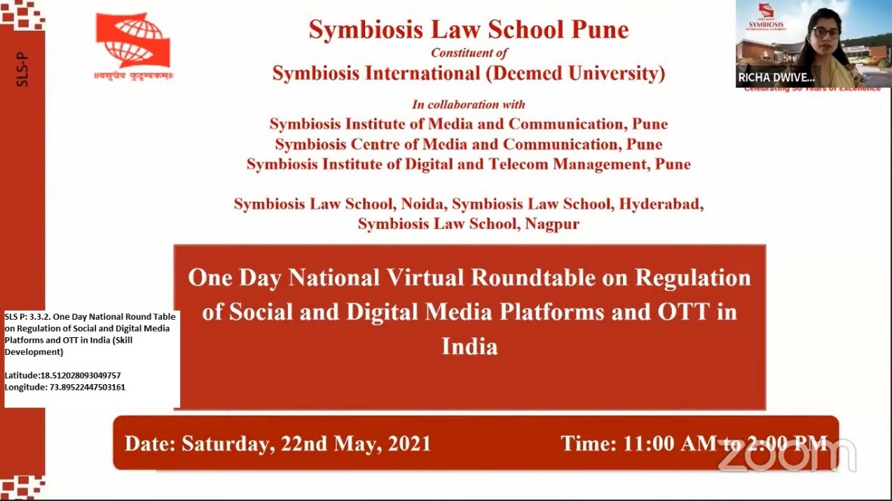 Symbiosis Law School, Pune organised a One-Day National Virtual Round Table on Regulation of Social and Digital Media Platforms and OTT in India, in collaboration with Symbiosis Institute of Media and Communication(SCMC), Pune, Symbiosis Institute of Media and Communication, Pune (SIMC), Symbiosis Institute of Digital and Telecom Management (SIDTM), Pune, on 22nd May 2021 at 11 am IST through Zoom platform.