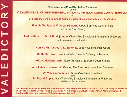 The Krishna National IPR Moot Court Competition-2014 is going to witness various historic moments this time. It is going to be a unique blend of substantive laws and the procedural requirements of intellectual property regime prevalent worldwide. The usual IPR Law based problem this time is based on national and international arbitration laws too. Justice Patil and Dr. Rajani Gupte took the audience by surprise by inaugurating the first ever symbiosis live webcast portal which will cover the final rounds including the Valedictory ceremony just by clicking at the link: Valedictory ceremony