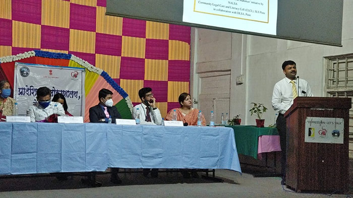 Following that, Prof Shirish Kulkarni was invited to deliver his speech. He spoke about the importance of providing legal aid by colleges, mentioning that it was Mr. Pratap Sawant’s vision to encourage colleges to collaborate with the DLSA in order to allow for access to justice for all. He emphasized that SLS Pune had contributed largely to this objective by conducting Lok Adalats, setting up Prison Programs as well as Legal Aid Clinics. He acknowledged that the aim of providing such aid by colleges should not just be to provide assistance in prisons, but also to encourage the spread of legal awareness in the rural areas as well as such parts of the society which requires proper legal aid like that in the mental hospital. He also spoke about setting up a legal aid clinic within the premises of the Mental Hospital, Yerewada, in order to assist the patients with their legal issues.